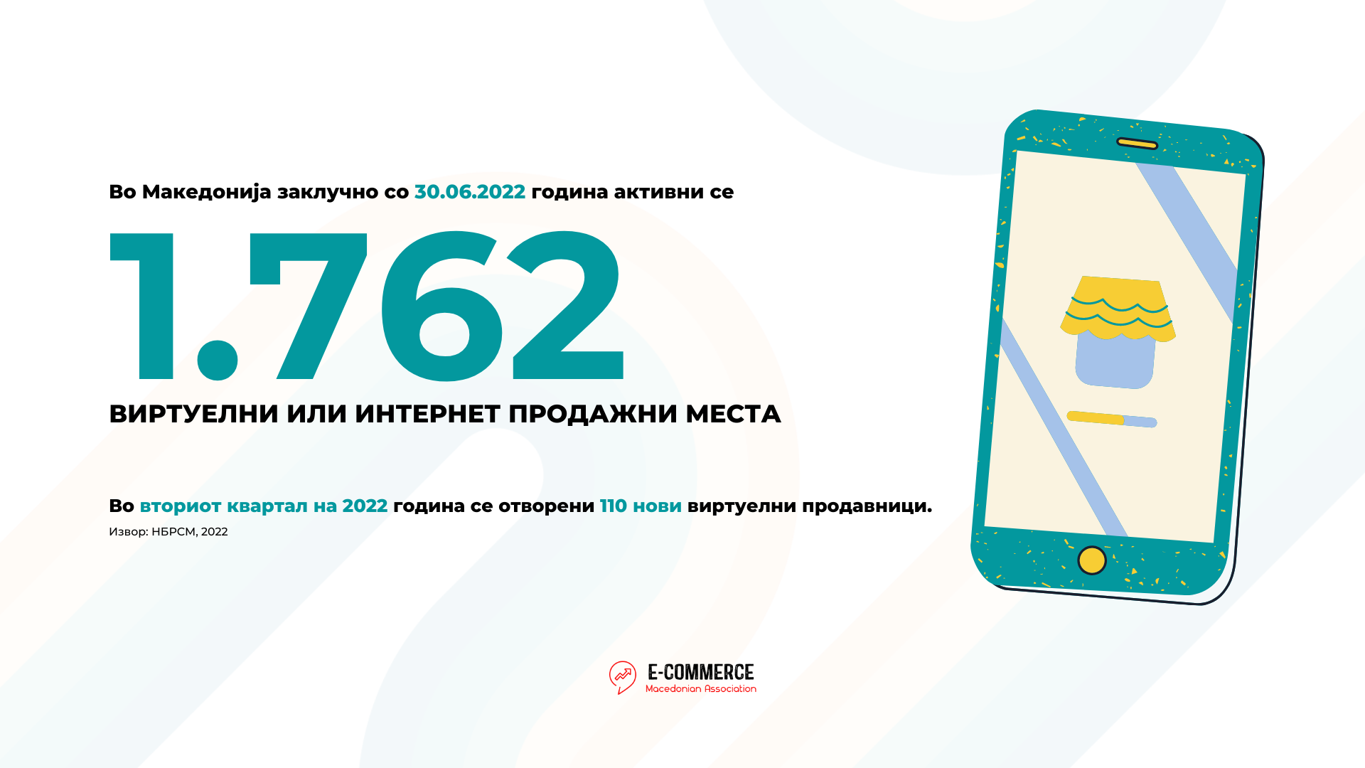 Согласно податоците за бројот на уредите на виртуелните места на продажба (интернет продажни места), заклучно со 30.06.2022 година во Република Северна Македонија активни се 1.762 продажни места. Во вториот квартал на 2022 година се отворени 110 нови виртуелни продавници.