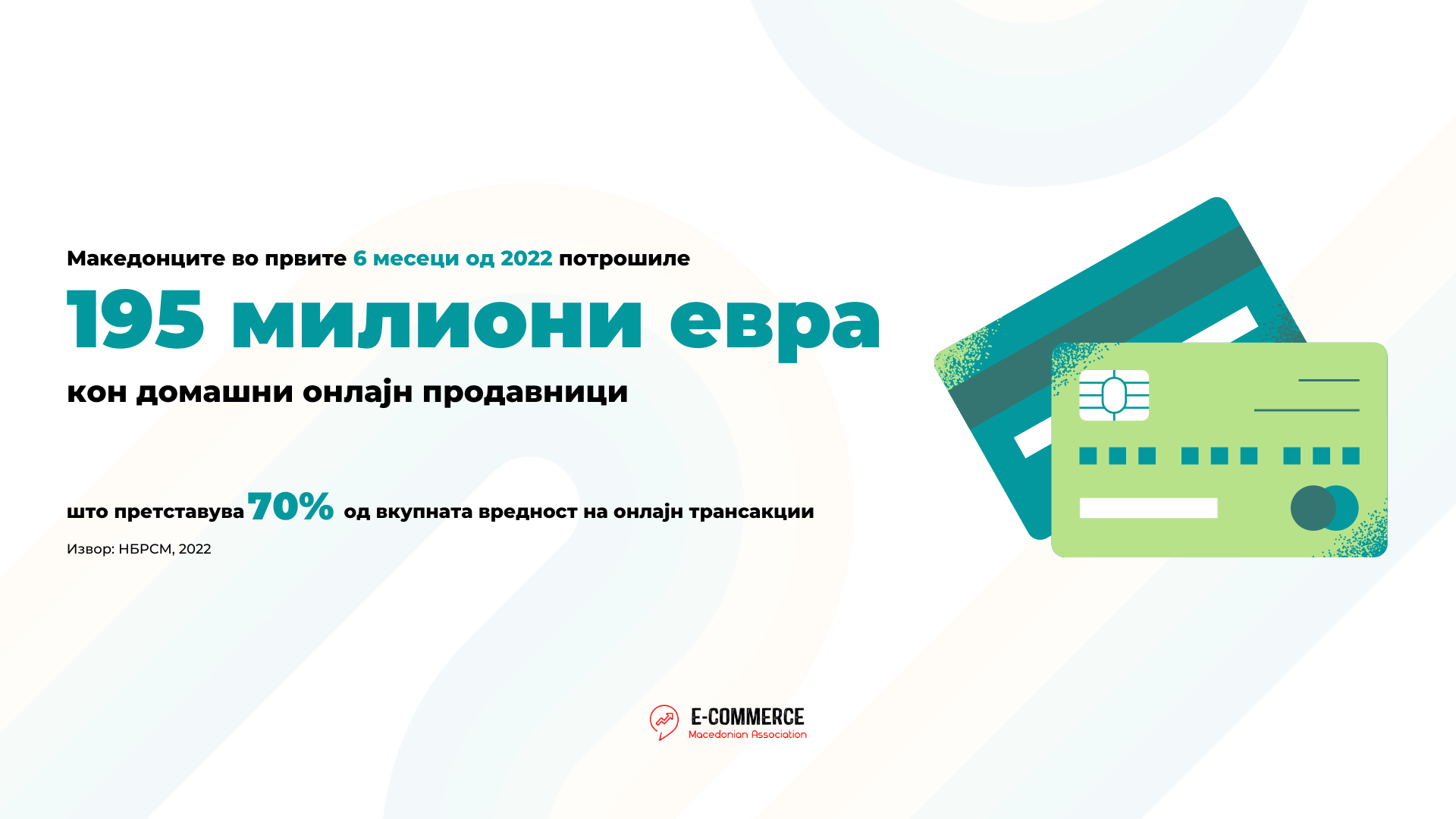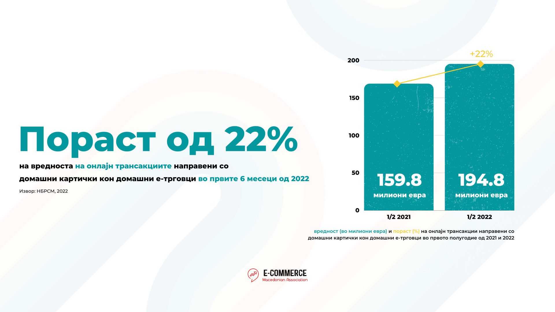 И во текот на првата половина од 2022 година, Македонците најмногу купуваат од домашните е-продавници, но темпото на пораст во однос на двете последни години е со помал интензитет. После остварениот пораст од 169% во првата половина од 2020 година и 83% во 2021 година, во текот на првите шест месеци од 2022 година Македонците со домашни картички кон домашни е-продавници потрошиле речиси 195 милиони евра онлајн, што претставува пораст од 22% во однос на истиот период претходната година (согласно ревидираните податоци за 2021 година на НБРСМ од март и јуни 2022).