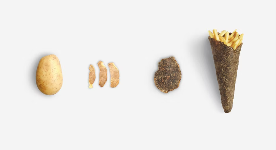 Алтернативно, можете да се направите пристап со нула отпад.  Повторно да ги користите деловите на вашите производи за да го обликувате пакувањето. Земете го пакувањето на сликата подолу. Брендот собра несакани лушпи од компири како остаток од нивниот производ (помфрит) и повторно ги искористи за да го создаде пакувањето во форма на  конуси. Тоа е иновативно, едноставно и незаборавно.