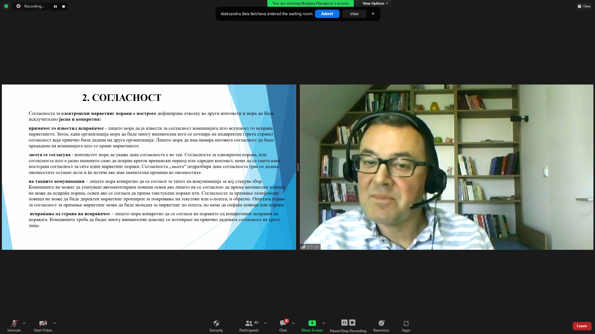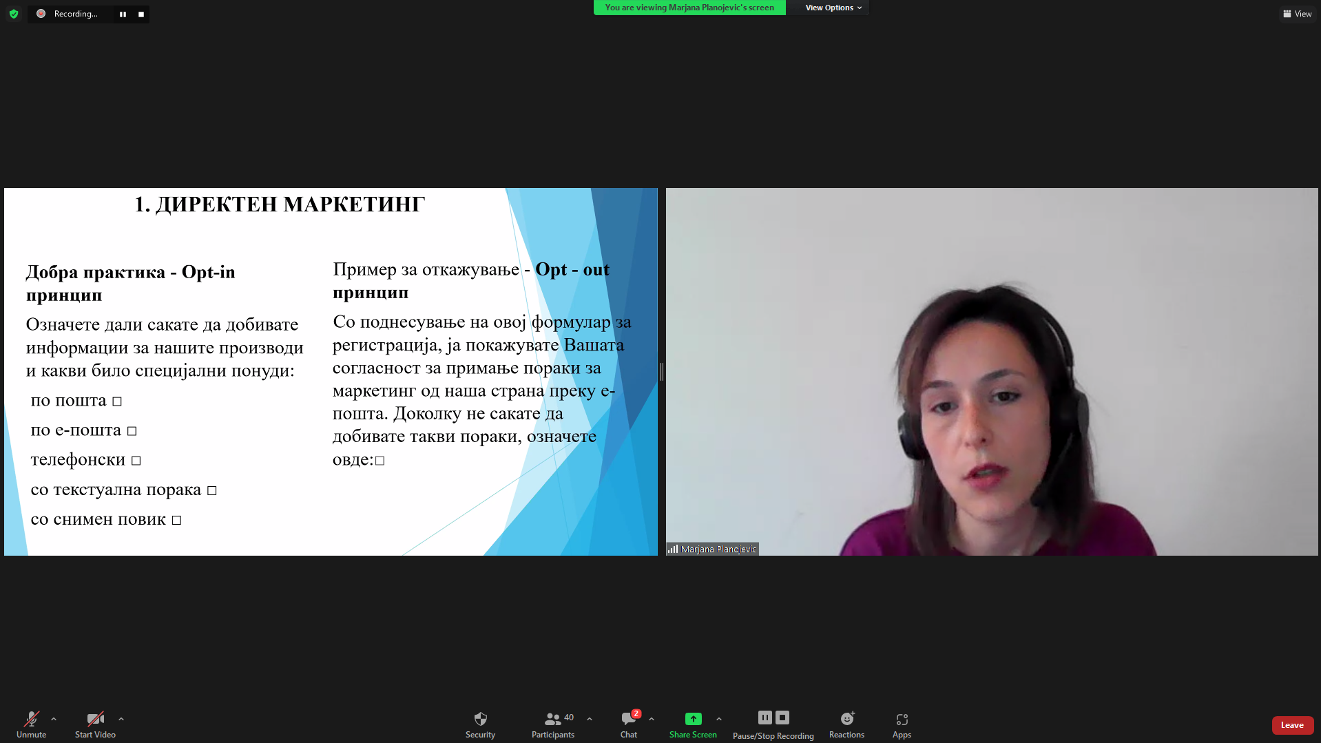 Предавачите на обуката Марјана Планојевиќ и Димитар Ѓеорѓиевски во 2 дела зборуваа за начинот како да се подобри заштитата на личните податоци во дигиталниот свет и како правилно да се користат личните податоци за цели на директен маркетинг. Во првиот дел, Марјана Планојевиќ – експерт за заштита на личните податоци, опфати теми како што се: правна анализа на новата легислатива, објаснување на поимот директен маркетинг, opt-in, opt-out, генерирање на потенцијални клиенти и маркетинг листа со лични податоци на клиенти, политика на приватност, известување за обработка на личните податоци, изјава за приватност и многу други. Во вториот дел од обуката, Димитар Ѓеорѓиевски – експерт за заштита на личните податоци, својот фокус го стави на Улогата на офицерот за заштита на личните податоци, односно Што е офицер за заштита на личните податоци, како да се направи усогласеност со новиот закон за заштита на личните податоци, што прави Офицерот по стапување на должност, аксицки план (анализа на работата и процесите) и многу други теми.